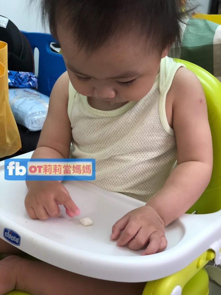 而圓片的米餅則是建議給6、7個月,開始會使用前三指(拇指、食指及中指)拿取物品的寶寶練習。因為OT莉莉選的圓片米餅厚度大約有0.5公分,對於這個月齡要嘗試透過拇指施力、使用三指取物的孩子來說,是個很好的開始。3公分的直徑也還在孩子可以全手掌打開拿取的範圍內。